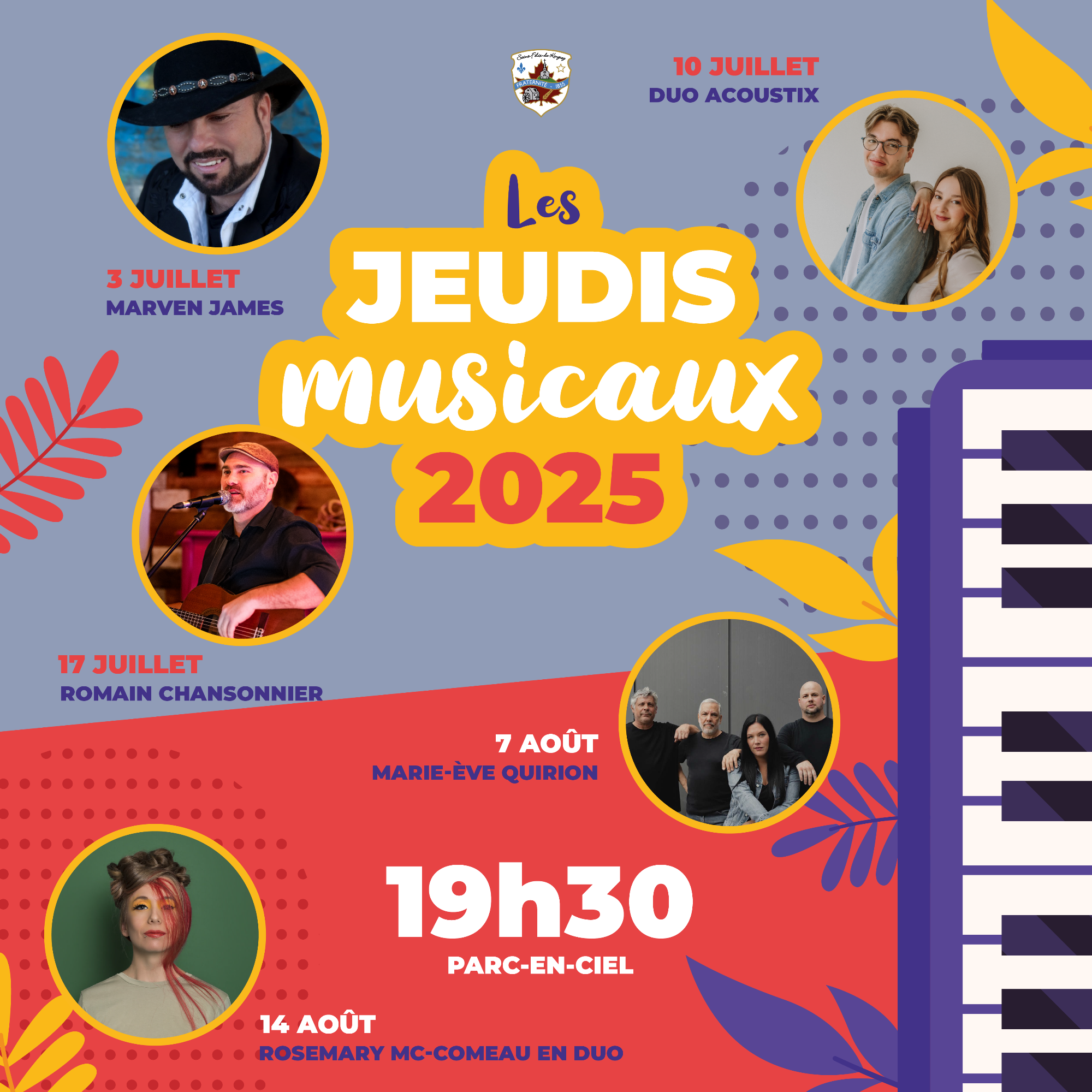 Venez profiter de ces soirées estivales en musique, en famille ou entre amis, et découvrir de merveilleux talents dans une ambiance chaleureuse. Les spectacles, gratuits et ouverts à tous, débuteront à 19 h 30, dans le cadre enchanteur du Parc-en-Ciel (1211 rue de l'Église, Saint-Félix-de-Kingsey).